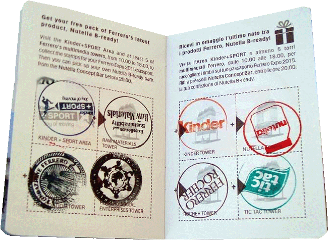 Ferrero ist auf der Expo 2015 in Milano vertreten. Als kleines Gedget gibt es diesen FERRERO PASSPORT. Der Pass beinhaltet viele Informationen zur Expo wie z. B. einen Lageplan. Natürlich werden besonders die Ferrero Produkte beworben, wie das untere Bild zeigt. Danke an unseren italienischen Freund Maurizio für die News