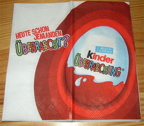 Diese Ü-Eier Servietten waren uns noch nicht bekannt und scheinen brandneu zu sein. Damit gibt es mittlerweile drei unterschiedliche Servietten mit Ü-Ei Motiv. [Direkt zu der News von 2010, wo die anderen beiden Motive der Servietten zu sehen sind. ] Wir wünschen Euch allen eine besinnliche Weihnachtszeit. Eine Sorte der Ü-Ei Servietten können wir im [online Shop anbieten. ] Danke an Bernd H. für die News