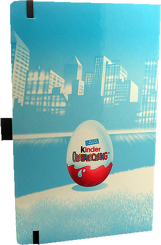 Immer wieder gibt es seltenes Werbematerial zu der aktuellen Ü-Ei Serie. Dieses Notizheft ist sehr schick und persönlich gestaltet. Die Qualität des 1,5cm dicken Notizheftes ist hochwertig. Auf der Rückseite kann man sehen, dass es ein schwarzes Gummiband gibt, womit das Heft geschlossen gehalten werden kann. Nach unseren Infomationen gibt es das Heft so nicht zu kaufen. Vergeben wird es von Ferrero. In dieser eBay Auktion gibt es so ein Notizheft