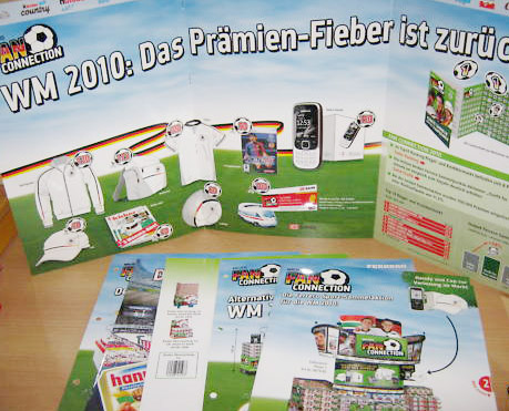Diese Werbeflyer verraten uns, dass es zur WM 2010 wieder eine Sammel-Aktion geben wird. Es werden Punkte oder besser gesagt kleine Bälle zum Ausschneiden auf den Ü-Eiern oder anderen Ferrero Süßwaren sein. Die aufgeklappte Werbemappe zeigt die Prämien. Sieht nach tollen Preisen aus! Es ist sogar ein Handy dabei. Quelle : [Angebot bei eBay]