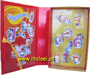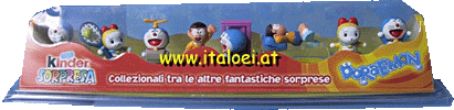 An diesem Rücksack befindet sich eine Pappschild mit diesen Informationen: "DORAEMON, CONTIENE 6 OVETTI 3 SORPRESE SICURE!" Danach ist der Rucksack eine Sonderverpackung mit 6 Ü-Eiern drin. [Link zu dieser Auktion] Dieses längliche Diorama der Doraemon ist das normale Seriendiorama. Die Serie besteht aus diesen 8 Figuren. Zu dem normalen Diorama ist noch zusätzlich dieses Buchhüllendiorama erschienen. Das Diorama kann mit dem auf der linken Seite zu sehenden Bändchen zugebunden werden. Am 31. 05. hatten wir schon über die Doraemon berichtet. [Zum Bericht]. Quelle: www. italoei. at