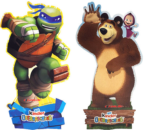 Um die aktuellen Überraschunsgeier Figuren zu bewerben, sind diese Pappaufsteller zum Teil in den Filialen anzutreffen. Höhe der Aufsteller ist 1,80 Meter.