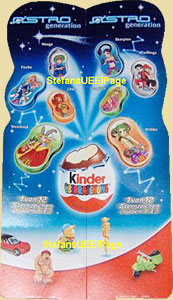 Passend zur "Astro Generation" ist nun dieser Kantenschoner erschienen. Die Kantenschoner befinden sich an den Seiten der großen Ü-Ei Aufsteller. Auf jeder Seite des Kantenschoners befinden sich vier verschiedene "Astro Generation Anhänger", in orange, grün, blau und weiß. Am unteren Rand befinden sich Abbildungen von aktuellen Spielzeugen, unter anderem den Smarts. [Die Astro Generation jetzt im Eierlei Shop]