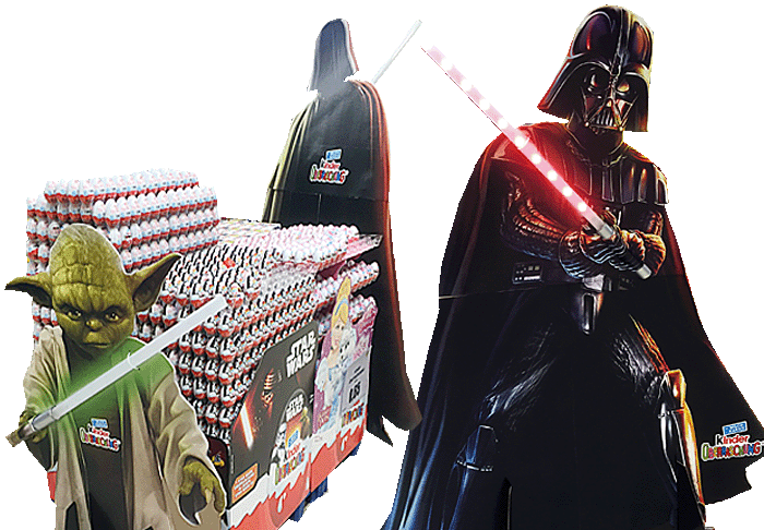 Rechts und links neben dem Überraschungsei Aufsteller sind Pappfiguren von Meister Yoda und Darth Vader platziert worden. Die Lichtschwerter der beiden leuchten sogar, so dass es ein besonderer Hingucker ist.