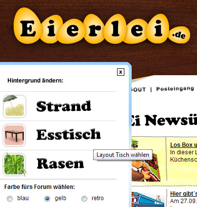 Heute haben wir auf das Winterlayout (Esstisch) auf Eierlei gewechselt. Alle angemeldeten Eierlei User können ihr Eierlei Layout frei wählen. Einfach auf den blau umrahmten Sonnenschirm klicken, danach kommt die Auswahl wie auf dem Bild zu sehen. Als weitere Einstellungen kann die Hintergrundfarbe im Forum ausgewählt werden. So kann sich jeder registrierte Eierlei User sein eigenes Eierlei Layout zusammenbauen. Das Anmelden auf Eierlei ist unverbindlich und einfach. [Zur kostenlosen Eierlei Anmeldung] Wir hoffen damit noch mehr Abwechslung auf Eierlei zu schaffen.