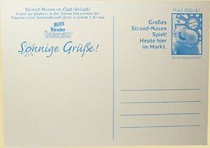 Am Wochenende gab es im Einkaufscenter Globus Saarbrücken eine Werbeaktion von den Strandnasen. Zur Werbeaktion war ein Glückrad aufgebaut, wo jeder dran drehen durfte. Zu gewinnen gab es ein Ü-Ei oder eine Strandnasen Figur. Des Weiteren gab es diese Postkarte. Die angedeutete Briefmarke mit Arnie Mateur zeigt das Glücksrad im Hintergrund. Die Vorderseite der Postkarte hat einen 3D Wackeleffekt. Der Wackeleffekt zeigt Volker Vorsicht und seinen Rettungsreifen mit und ohne rote Nase . Der Text oben links verlängert sich in "HALLO DU STRAND-NASE". Wir denken und hoffen, dass es noch mehr von diesen Werbeaktionen geben wird. Danke an Dirk für die News