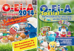 Dies sind die beiden Cover der kommenden O-Ei-A Kataloge. Auslieferungsstart ist der 23. 08. 2013. Bei dem "O-Ei-A das Original" handelt es sich um eine 20 jährige Jubiläumsausgabe. Im Katalog sind 1568 Seiten voller Ü-Ei Inhalte mit Preisen und zum Anmakern. Kleine Besonderheit ist der Glanzumschlag. Von dem O-Ei-A Original gibt es noch eine Ausgabe mit Hartcover Umschlag, die auf 500 Stück limitiert ist. Zur Ergänzung des O-Ei-A gibt es den Spezial Katalog in 2. Auflage mit 960 Seiten. Die erste Auflage vom Spezial war in der letzten Saison ausverkauft. Der neue O-Ei-A Spezial gibt einen guten Überblick von weiteren Sammelgebieten rund um das heiß begehrte Überraschungsei. Beide Kataloge zusammen gibt es im günstigeren Bundle Preis, jetzt im [Eierlei Ü-Ei Shop].