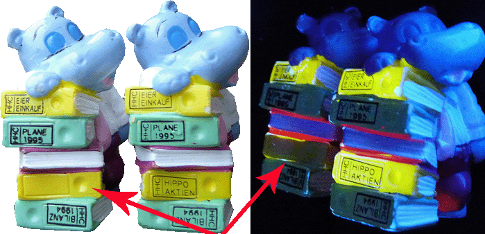 Gefälscht wir in jedem Sammelgebiet, wo es sich lohnt. Übergreifende Sammler wissen, dass der Ü-Ei Bereich sehr gut aufklärt, was Fälschungen bzw. Plagiate angeht. Es gibt Sammlergebiete, dort wird das Thema Fälschungen totgeschwiegen. Bei unseren geliebten Ü-Ei Figuren gibt es inzwischen in jedem Katalog Vergleichsmöglichkeiten und sogar einen kompletten Fälschungskatalog. Wirklich vorteilhaft ist hier gute und schnelle Aufklärung im Internet. Lange Berichte mit ausführlichen Informationsmaterial. In Foren kann gut eine Frage zum Thema Fälschungen platziert werden. Leider ist es dem ein oder anderen Sammler und Händler zu müßig, jede Figur, wo was nicht stimmen könnte, nachzuschlagen. Bei diesem Träumer Tommy ist eine Variante nachgemacht worden, wo der vorletzte Ordnerrücken ohne Druck versehen ist. Bei Tageslicht und unter der Lupe war nicht zu erkennen, ob es sich vielleicht um eine Fälschung handelt. Der Glanz der gelben Farbe ist genau identisch und es schimmert auch nichts durch. Unter der 24Watt UV Lampe ist die Wahrheit schnell hervorgekommen. Hier wurde einfach der Ordnerrücken mit exakt der gleichen Farbe übermalt, die aber nicht fluorisziert. Mit einer guten UV Lampe ist es ein Kinderspiel, diese Fälschung zu entlarven. Wir können an dieser Stelle an alle appellieren sich mit dem Thema auseinanderzusetzen und weiterzubilden. Genau genommen ist der Reiz so noch größer, Figuren und Varianten zu haben, die nicht gefälscht sind. Auf Eierlei gibt es eine umfangreiche Rubrik mit 23 Unterseiten rund ums Thema Fälschungen. Vor einer Woche gab es beim Trödeltrupp leider wieder die große Überraschung, dass das kostbare Zubehör der riesen Sammlung gefälscht war. So ist der angezielte Preis von 6000 Euro auf ein paar Hundert Euro gesunken. Wer die Folge verpasst hat, kann sie hier auf RTL2 in Ruhe anschauen www. rtl2. de. Das sollte jeder Sammler über Fälschungen wissen: [Zur Eierlei Fälschungsrubrik]
