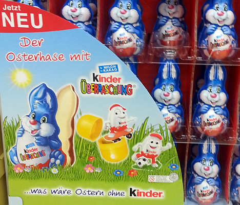 In Deutschland wurden die ersten Kinderino Figuren gesichtet. Sie stecken in Harry Hase. Das Bild zeigt uns einen Aufsteller. Der Preis pro Hase ist 2,29 Euro. Anscheinend handelt es sich dabei um deutsche Testware. Die Beipackzettel von Kinderino Sport sind neutral wie in Russland. Um alle 8 Figuren zu bekommen, muss viel Schokolade gegessen werden :-) Oder die Sätze einfach im Eierlei Shop bestellen: [Zum umfangreichen Ü-Ei Shop. de]