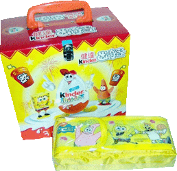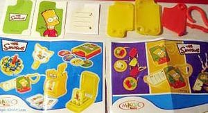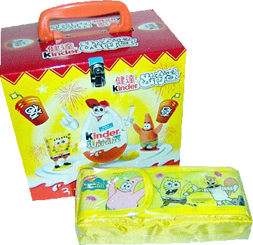 In den tschechischen Kinder Joy Eiern sind die Simpsons los. Das Bild zeigt ein Werbeflyer mit einer Gesamtlänge von 59 cm. Quelle: [Diese eBay Auktion] Die ersten Spielzeug Inhalte der Simpsons sind auf eBay zu bekommen. Auf dem Bild ist der Schlüsselanhänger von Bart zu sehen. Quelle:[Diese eBay Auktion] Aus Taiwan kommt dieser Werbekoffer von Spongebob. Vor dem Koffer liegt eine kleine Tasche von Spongebob, die unter anderem im Koffer enthalten ist. Quelle: [Diese eBay Auktion]