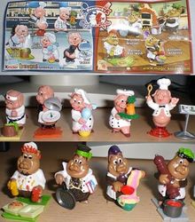 Bevor der Serienstart angelaufen ist gibt es die ersten Figuren und BPZ. Als erstes möchten wir kurz den BPZ vorstellen. Der BPZ sieht aus wie zweigeteilt. Links ist das blaue Team "Pigfein" und rechts ist das Küchenteam "Schweinelecka". Das Team Pigfein besteht aus 5 Schweinchen. Die Namen: Hick Hack, Toni Tatääää, Kalle Konfekt, Didi Deko und Ottmar Oktav. Das Schweinelecka Küchteam besteht aus 4 Wildschweinen. Die Namen: Ronnie Rot-Weiß, Brunold Brutzel, Antonio Aldente und Willi Chili. Fünf Figuren sind mit Zubehör ausgestattet. Die Bemalung sieht sehr detailliert und modern aus. Damit scheint es wirklich ein saustarkes Duell in der Küche zu werden ;-) Die ersten Sätze sind in [dieser eBay Auktion zu bekommen].