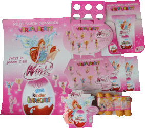 Das Foto zeigt von links ein A3 Poster der Winx, in der Mitte sind zwei unterschiedliche Palettenanhänger, einmal von den Ü-Eiern und einmal vom 4er Pack, unten in der Mitte ist ein 4er Pack der Winx zu sehen und oben rechts geht es weiter mit einer Box, wo Werbekarten der Serie enthalten sind. Auf der Rückseite der Karten werden die Figuren vorgestellt. Unten rechts ist der Satz Winx 2011. Im Shop können wir eine sehr geringe Menge von der seltenen Testware anbieten. Mehr Bildmaterial der Figuren ist ebenfalls im Shop zu sehen. [Direkt zum umfangreichen Eierlei. de Shop].