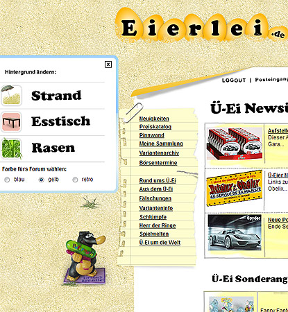 Heute zum Sommeranfang haben wir auf das Sommerlayout (Strand) auf Eierlei gewechselt. Alle angemeldeten Eierlei User können ihr Eierlei Layout individuell wählen. Einfach auf den blau umrahmten Sonnenschirm klicken, danach kommt die Auswahl wie auf dem Bild zu sehen. Als weitere Einstellung kann die Hintergrundfarbe im Forum ausgewählt werden. So kann sich jeder registrierte Eierlei User sein eigenes Eierlei Layout zusammenstellen. Das Anmelden auf Eierlei ist unverbindlich und einfach. [Zur kostenlosen Eierlei Anmeldung] Wir hoffen, damit noch mehr Abwechslung auf Eierlei zu schaffen.