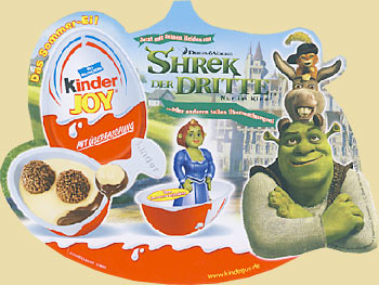 Der PAH zeigt Shrek, Fiona, Esel und den gestiefelten Kater. Über dem Kinder Joy Ei steht "Das Sommer Ei!" Quelle: [Eierlei Forum]