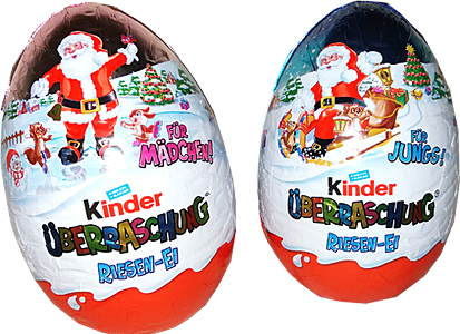Diese beiden Überraschungseier nennt Ferrero "RIESEN-EI". Der Preis pro Ei liegt bei 7,99 Euro. Der Weihnachtsmann auf der Umverpackung zeigt deutlich, dass es sich hierbei um die Weihnachtsware handelt.