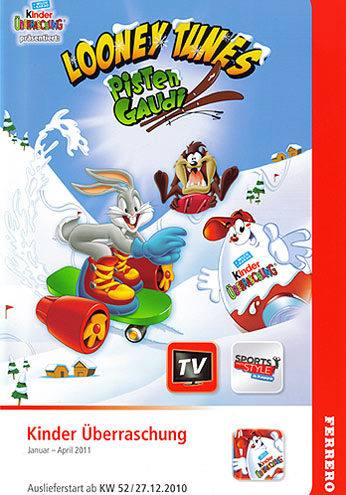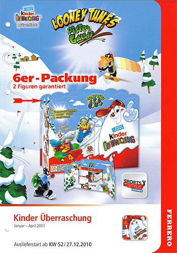 Ende Dezember kommt in Deutschland eine neue Ü-Ei Serie raus. Passend zur Winterzeit gibt es die Looney Tunes mit dem Untertitel "PISTEN GAUDI". Der Satz besteht aus 6 Figuren. Alle 6 Figuren sind auf dem kleinen Werbeblatt zu sehen. Die Serie wird bis April 2011 in den Ü-Eiern stecken. Das Werbeblatt unten rechts wirbt für ein 6er Pack der Looney Tunes. Im 6er Pack werden 2 Figuren der Serie garantiert. Die Verpackung vom 6er Pack kann auseinander geklappt werden, so dass sich eine Zieleinfahrt ergibt. Quellenangaben der Ü-Ei Neuigkeiten sind diese eBay Auktionen: [ Kleines Übersichtsblatt der Looney Tunes ] [Großes Werbeblatt mit zwei Looney Tunes Figuren und Eiermann] [ 6er Pack der Looney Tunes ] Danke für die News an Hans-Dieter G.
