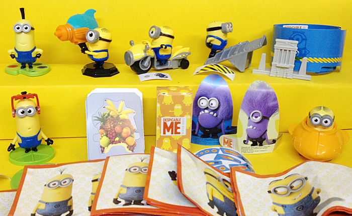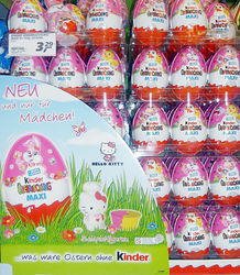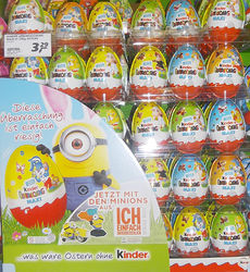 Hier ein Aufsteller der Oster Maxi Eier. Der Preis pro Ei beträgt 3,29 Euro. Auf der Maxi Ei Umverpackung ist nicht zu sehen, ob Minions enthalten sind. Die Umverpackung sind klassische Oster Motive. Der Maxi Ei MINIONS Satz umfasst 6 Figuren und Spielzeug. [Zu bekommen in dieser eBay Auktionen] Neben den Minions Aufsteller steht dieser Hello Kitty Aufsteller.