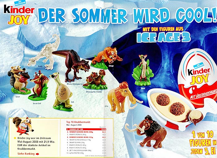 Am 4. 5. 2009 kommen 10 neue ICE AGE 3 Figuren ins Kinder JOY Ei. Das Bild zeigt die 10 neuen Figuren. Links auf dem Bild geht es los mit Scrat, Scrat Girl, Rudy, Sid, Mama Dinosaurier, Dinosaurier Kinder, Diego, Eillie, Buck und Manny. Laut Werbung wird in jedem dritten Ei eine ICE AGE Figur sein. In diesem Forum Beitrag könnt ihr gerne über die neue Serie diskutieren [Zum Ice AGE 3 Beitrag]. [Link zum ICE AGE 3 Kino Trailer]