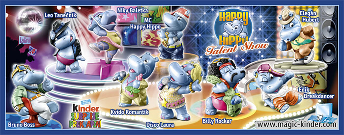 Hier ein gutes Foto von den Figuren der Happy Hippo Talent Show. Die Figuren sehen cool, skurril, glamourös, fetzig, schnulzig oder einfach genial aus. Die Serie wird am 12. 10. ausgeliefert und bis Dezember im Ü-Ei sein. Angebot bei eBay Dies ist der Happy Hippo BPZ, aber aus der Slowakei.