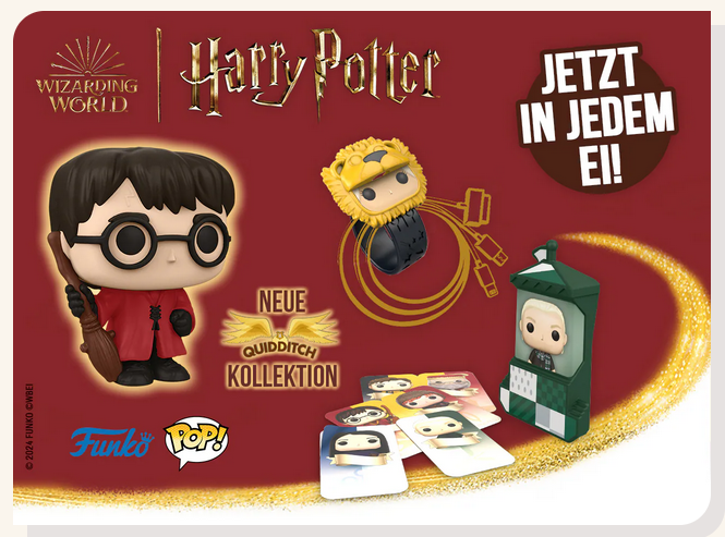 Das Bild zeigt unter anderem den Hinweis, dass in jedem KinderJoy Ei Inhalte der Serie enthalten sind.