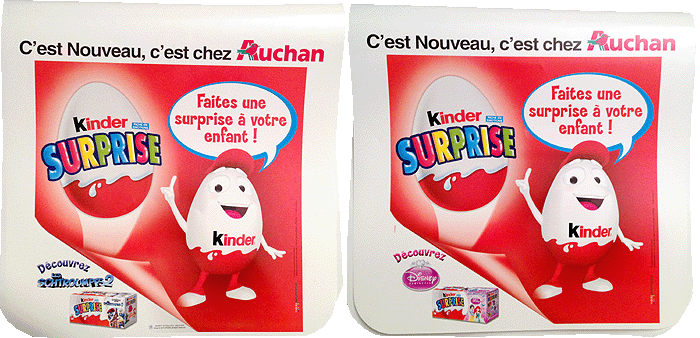 Diesen Werbeanhänger gibt es jetzt in Frankreich. Zu finden sind sie am Einkaufswagen. Die Anhänger werden über die Handstange des Einkaufswagens gehängt und mit einer Klammer befestigt. Geworben wird für die Schlümpfe 2 und die Prinzessinnen. Das Bild zeigt ein Anhänger von beiden Seiten. Jeder der sich einen Einkaufswagen schnappt, wird auf diese Art der Werbung aufmerksam, was sehr effektiv sein sollte. Im Shop können wir alle Figuren der Serien anbieten [Zum umfangreichen Ü-Ei Shop auf Eierlei. de].