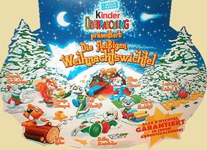 Die Weihnachtswichtel kommen im Adventskalender und 4er Pack. Titel der Serie: "Die fleißigen Weihnachtswichtel". Der PAH zeigt alle 8 Figuren der Serie und ihre Namen. Unten rechts steht noch die Garantie, dass es in jedem Adventskalender alle 8 Wichtel geben wird. Es gibt von den 4er Packs der Wichtel einen ähnlichen PAH nur sternförmig. Auf der Ü-Ei Börse in Klein-Gerau gibt es die Adventskalender der Wichtel. Börsentermin 7. 10 start 10 Uhr. [Live Suche auf eBay nach den ersten Weihnachtswichtel Sätzen starten]