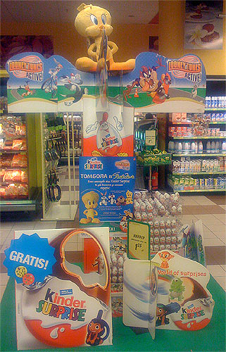 In Dänemark gibt es jetzt aktuell dieses Ü-Ei 3er Pack, im Herbst soll ICE AGE 3 rauskommen. Hier haben wir noch einen schönen Supermarkt Aufsteller von den Looney Tunes aktiv. Das Land des Supermarktes müsste Argentinien sein, aber da sind wir uns nicht ganz sicher.