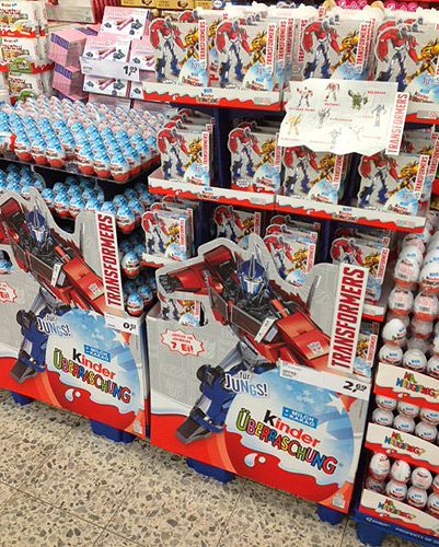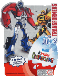 Auf dem Cover des 4er Packs der Transformers sind die beiden Hauptfiguren Optimus Prime und Bumblebee zu sehen. Pro 4er Pack werden wie immer 2 Figuren garantiert Momentan spricht alles dafür, dass es sich bei den Transformers Figuren um Testware handelt. Hier ein Aufstellergebinde von den Transformers. Der Preis pro 4er Pack beträgt dort 2,69 Euro. Die Transformer Ü-Eier sind oben blau und mit Sternen versehen. [Live Suche auf ebay nach Transformers starten].