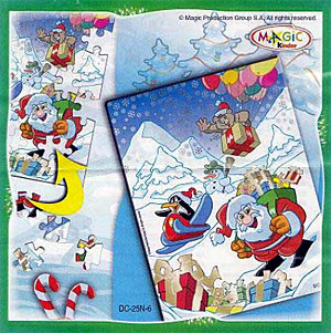 Zu der Andventskalender Serie 2011 gibt es diese Maxi Inhalte. Der Beipackzettel oben zeigt alle 5 Inhalte. Es sind vier Spielzeuge und ein Puzzle. Der untere BPZ ist vom Puzzle der fliegenden Weihnachtsboten. Das erste Maxi Ei ist damit schon geknackt. Auf eBay werden die Auktion der Serie langsam aber sicher mehr: [Live Suche auf eBay nach den Weihnachtsboten starten].