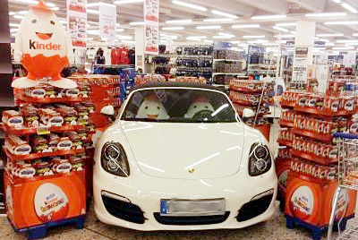 Bei der aktuellen Werbung für die neuen Porsche Modelle kann keiner so einfach vorbeigehen ohne hinzuschauen. Spätestens wenn man die beiden lachenden Eiermänner hinter der Windschutzscheibe entdeckt, muss man schmunzeln. Rechts, links und hinter dem weißen Porsche stehen Aufsteller der 4er Packs mit den Porsche Modellen aus dem Ü-Ei. Die Eiermänner sind neu. Der alte Eiermann hatte ein anderes Gesicht und den Schriftzug Überraschung auf der Brust. Diese Eiermänner tragen den allgemeinen Ferrero Schriftzug "Kinder". [Jetzt im Shop zu bekommen] Quelle: Eierlei Forum