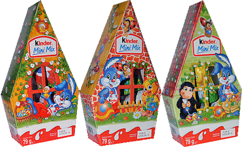 Das Bild zeigt drei unterschiedliche Kinder Mini Mix Packungen von Ferrero. Was zu Ostern nicht fehlen darf ist das Ü-Ei, wovon eins pro Packung enthalten ist.