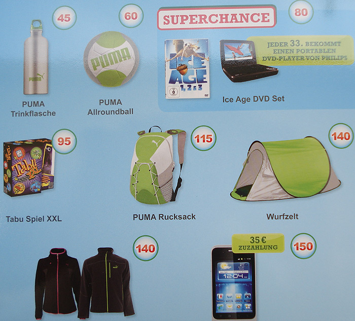 Nächstes Jahr geht eine neue Sammelrunde an den Start. Genauer Termin soll der 02. 01. 2013 sein. Das Bild zeigt uns das Sammelheft und die Punkte zum Ausschneiden. In den Sammelpunkten steht "fun for you". Die Prämien sind von PUMA, wie das untere Bild zeigt. Bei 80 Punkten nimmt man automatisch an einer "Superchance" Teil. Jeder 33. Teilnehmer bekommt einen portablen DVD Player + ICE Age DVD Set. Danke an Bernd für die Neuigkeiten