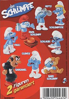 Im gleichen Layout wie der PAH ist das 4er Pack der Schlümpfe gestaltet. Garantiert werden 2 Figuren der Serie pro 4er Pack. Auf der Rückseite sind die Figuren der Serie zu sehen. Quelle: [Eierlei Forum]