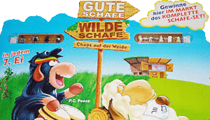 Das Bild zeigt den Pappaufsteller der Serie "Gute Schafe - Wilde Schafe". Oben kündigt eine Wolke den Gewinn an. In dem Aufsteller sind zwei Plastikröhren integriert, die das Schafe-Set enthalten. [Suche auf eBay nach den Schafen]