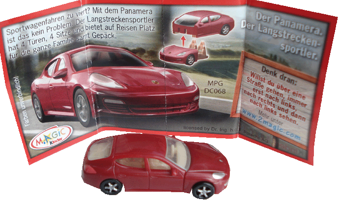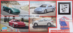 Auf dem Bild ist der Panamera Porsche in rot zu sehen. Der BPZ zum Panamera beinhaltet die Bauanleitung und eine Kurzbeschreibung zum Wagen. Rechts unten ist noch ein Schild zu sehen, wo ein Spruch zur Verkehrsicherheit steht. Wir gehen davon aus, dass bei den anderen Porsche Modellen immer ein anderer Spruch stehen wird. Die Vorderseite des BPZ zeigt die Porsche Reihe mit allen 4 Modellen. Rechts oben in der Ecke ist noch ein schwarz weißes Porsche Logo, welches als Code der auf 2magic. com eingelöst werden kann. Die Webseite 2magic. com ist noch nicht aktiv. Quelle: Diese eBay Auktion