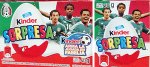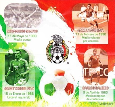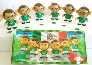 In Mexico gibt es diesen Satz Twistheads Figuren. Die sechs Spieler sind Fußball Legenden. Auf dem Beipackzettel sind die Namen der Spieler aufgeführt. Die mexikanischen Spieler gibt es wie in Deutschland noch als Spielfiguren zum Bekleben. Das Foto zeigt ein Zweier- und ein Einer-Pack der Figuren. Auf der Verpackung sind drei Spieler zu sehen. Als Zubehör zur Serie gibt es diese Wackelbilder. Das Layout ist in den drei Farben der Nationalmannschaft gehalten. Quelle: [Diese eBay Auktion]