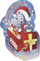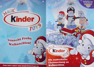 Das Bild zeigt einen Geschenkanhänger. Oben ist ein kleines Loch, wo ein Band zum Aufhängen durchgezogen werden kann. Unten sind zwei Zeilen mit ein Stern davor, wo der Name eingetragen werden kann. Niedlich anzusehen ist wie der Happy Hippo im Geschenk steht als Weihnachtsmann verkleidet und frohe Weihnachten wünscht. Geworben wird mit dem Anhänger für die Magic Kinder Toys. Auf dem unteren Bild ist ein Werbeprospekt der Magic Kinder Toys zu sehen. Auf der Rückseite sind die Spielsachen der Happy Hippo Talent Show abgebildet. [Alle Figuren zur Serie im Eierlei Shop] Danke an ramobie für die News