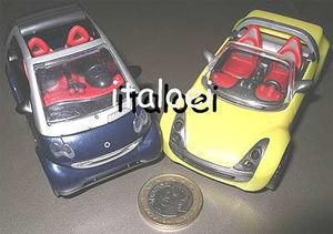 Diese beiden Smart Modelle werden 2005 in den Maxi Eiern erscheinen. Links ist das Crossblade Model und daneben das gelbe Roadster Coupé Madel. Die beiden sehen genau so aus wie ihre kleinen Brüder aus den normalen Ü-Eiern. Die Besonderheit ist allerdings der Rückzugmotor der beiden, der die Kraft des Fahrens verleiht. Die Euro Münze dient als Größenvergleich. Die großen Modelle gibt es in dieser Auktion. [Link zur Auktion, wo auch noch Bilder der BPZ zu sehen sind].