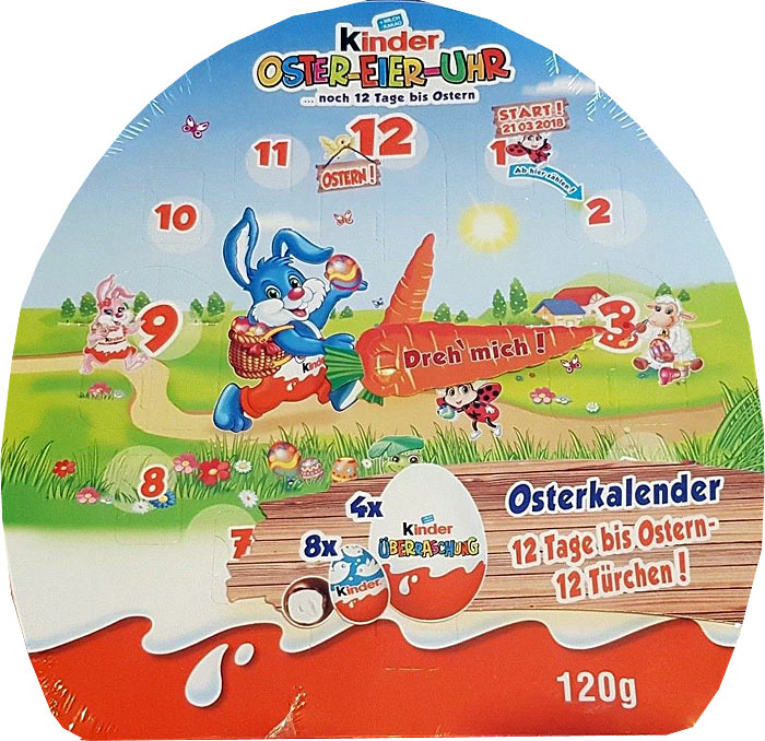 Eine neue tolle Idee für Kinder ist diese Oster-Eier-Uhr. Letztlich das Prinzip vom allseits bekannten Adventskalender. Dieser Kalender ist mit 12 Eiern bestückt, davon sind 4 Stück Kinder Überraschungseier. Die Karotte in der Mitte kann mit dem Finger weitergestellt werden. Es handelt sich bei der Oster-Eier-Uhr jedoch leider nur um Testware.