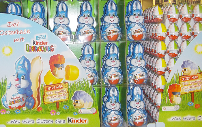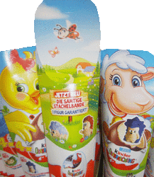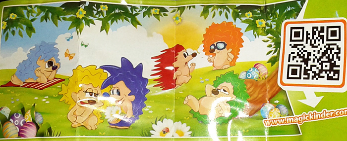 Als Oster Serie 2015 gibt es die samtige Stachelbande. Das Foto zeigt uns zwei Aufsteller. Links ist Harry Hase, der eine Ü-Ei Kapsel im Bauch hat. Rechts sind die Serien Ü-Eier im Oster Motiv zu sehen. Auf dem Eckschoner wird mit der Stachelbande geworben. Dies sind 4er Packs der samtigen Stachelbande. Pro Packung wird eine Figur der Stachelbande garantiert. Die 4er Packs gibt es in 3 unterschiedlichen Motiven. Die Igelfiguren heißen samtige Stachelbande, da die Spitzen nicht stachelig, sondern samtig sind. Der Preis pro 4er Pack ist ca. 3,50 Euro. Bei unseren österreischischen Freunden gibt es die gleichen 4er Packs. Die ersten Sätze und vieles mehr jetzt im [Eierlei-Shop]. Die Rückseite der Stachelbande zeigt die Figuren in Aktion.
