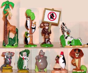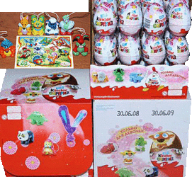 Schon heute können wir Euch Galleriebilder von den Madagascar 2 Figuren präsentieren. Der Satz besteht aus diesen 9 Figuren. Erscheinen soll der Satz bis jetzt in Frankreich und das so um die Weihnachtszeit. Danke an stapelix für die Bilder. In Frankreich gibt es dieses 3er Pack von den Monster Piraten. Leider ohne Figurengarantie. Dieses Thekendisplay kommt aus Russland und beinhaltet 36 Ü-Eier. Die Displays und Ü-Eier sind mit sehr viel Rosa designt, so dass es wohl mehr die Mädchen ansprechen soll. In den Ü-Eiern ist unter anderem eine Tierserie, die aus 8 Figuren besteht (oben links auf dem Bild zu sehen). Die 8 Figuren sind mit einem Band versehen, so dass sie als Anhänger genutzt werden können.