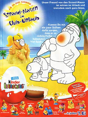 In etlichen Comic Heften ist diese Strandnasen Werbung zu sehen. Die Besonderheit diesmal ist, dass die Figur Schläck & Wäck und die Biene von Susi Summ ausgemalt werden kann. Im unteren Bereich sind alle 10 Figuren der Serie zu sehen. Die Klassiker an Werbung wie das Ü-Ei, der Slogan "in jedem 7. Ei" und das die Strandnasen anfangen sich zu verändern fehlen natürlich nicht. Eine gute Idee, da die Kinder so nicht nur die Figuren kurz sehen und weiterblättern, sondern kreativ werden können.