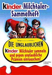 Ferrero hat eine neue Milchtaler Aktion gestartet. Rechts auf dem Bild sind die Prämien der Milchtaler zu sehen. Dabei handelt es sich um Promotionsartikel von den Unglaublichen. Um die Prämien in Großformat zu sehen, bitte das Bild anklicken. Die Unglaublichen sind Disney Helden, die am 9. 12. 04 im Kino anlaufen. Fünf von den Helden sind auf dem Plakat zu sehen. Nach unseren Informationen sollen auch die 8 Charaktere als Ü-Ei Figuren im Januar in die Ü-Eier kommen. Der endgültige Beweis fehlt aber noch.