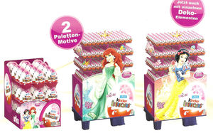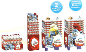 Laut Werbeblatt soll am 5. August die Auslieferung der neuen Ü-Ei Serie starten. Es kam in der Vergangenheit schon vor, dass die Auslieferung auf Grund zu hoher Sommertemperaturen verschoben wurde. Der Teilausschnitt des Werbeblattes zeigt, in welchen Aufstellern uns die Prinzessinen angeboten werden. An den großen Aufstellern bei Arielle und Schneewittchen sind links Palettenanhänger zu sehen. Die Prinzessinen Eier sind in blumiger rosa Umverpackung. Bei den Schlümpfen 2 ist das bekannte 72er Thekendisplay an erster Stelle zu sehen, dann kommt ein Bodenaufsteller und zuletzt mit zwei unterschiedlichen Motiven die großen 672er Ü-Eier Aufsteller. An den großen Schlumpfaufstellern ist ein QR Code zu finden, der einen direkt zu den Informationen der Schlümpfe 2 im Ü-Ei führt. Bei den beiden großer Aufstellern sind ebenfalls PAH zu sehen.