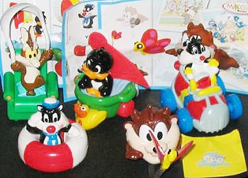 Aus Italien kommt dieses Mini Maxi Ei. Es schaut auf dem ersten Blick mit Verpackung genau so aus wie ein Maxi Ei. Das Bild der drei Kapseln zeigt, dass es sich um eine Zwischengröße handelt. In den Mini Eiern sind die Baby Looney Tunes. Auf dem Bild rechts sind die 5 Baby Looney Tunes Figuren zu sehen. Zum bekommen sind die Figuren hier: [Link zu allen eBay Auktionen vom Ü-Ei Punkt Berlin]