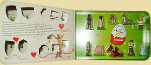 Das Diorama von Shrek der Dritte ist ein Buchhüllendiorama. Das linke Bild zeigt das Diorama im geschlossenen Zustand. In der Mitte befinde sich das Gesicht von Shrek und unten rechts steht Tagebuch. Im geöffneten Zustand sind alle 10 Sammelfiguren der Serie zu sehen und ein Kinder Joy Ei. In der linken Hälfe steht noch eine Kurzgeschichte. Quelle: [Diese eBay Auktion]