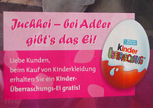 Das Bild zeigt einen Ausschnitt aus einem aktuellen Werbeprospekt von Adler Moden. Zitat: "Juchhei - bei Adler gibt\'s das Ei!" Liebe Kunden, beim Kauf von Kinderkleidung erhalten Sie ein Kinder Überraschungs-Ei gratis! So was ist doch für alle Beteiligten eine gute Sache :) Danke an Marko für die News
