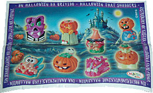Zu Halloween 2004 kommen unter anderem diese 8 Figuren, die eine Serie ergeben. Die Kürbisse und Fratzen sind teilweise selbst leuchtend. Der Kürbis unten links ist mit einer Batterie ausgestattet, so dass er aus Augen, Nase und Mund anfängt zu leuchten, wenn man den Knopf drückt. Die Vorderseite zeigt die ganze Serie. Jede Halloween Figur hat einen extra BPZ, wo auf der Rückseite z. B. die Funktion beschrieben ist und die deutliche Auswirkung des Leuchteffekts gezeigt wird. [Hier noch ein älterer Bericht der Halloween 2004 Sachen] [Link zu der Halloween Auktion]
