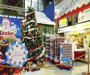 Auf dem Frankfurter Hautbahnhof ist schon jetzt Bescherung. Ferrero hat im Foyer einen großen Stand mit Leckerein aufgebaut. Vorne links auf dem Bild ist ein Glücksrad zu sehen, welches zum Mitmachen einlädt. Rechts neben dem Tannenbaum sind die Gewinne vom Glückrad zu sehen. Tolle Idee und eine gute PR Aktion.