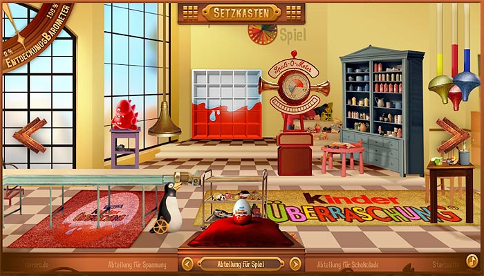 Wer die Ferrero Webseite Kinderueberraschung. de aufruft, kann viel entdecken. Als erstes muss die Ü-Ei förmige Eingangstür angeklickt werden. Im Inneren gibt es mehrere Abteilungen, wie z. B. die "Abteilung für Spiele". Mit den Pfeiltasten rechts und links kann das Bild in die jeweilige Richtung verschoben werden. Es gibt noch die Schokoladen Abteilung und die Abteilung für Spannung, wo z. B. an einem Hütchenspiel teilgenommen werden kann. Oben links in der Ecke ist ein Entdeckungsbarometer. Das Ganze ist sehr umfrangreich und detailliert.